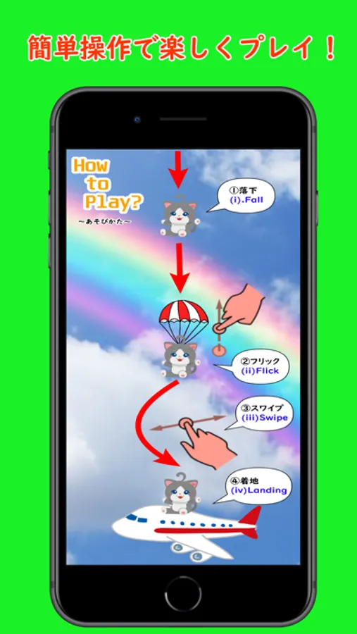 操作は簡単、先ずは、落下しているどうぶつを上方向にフリックしてパラシュートを広げよう。