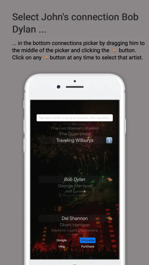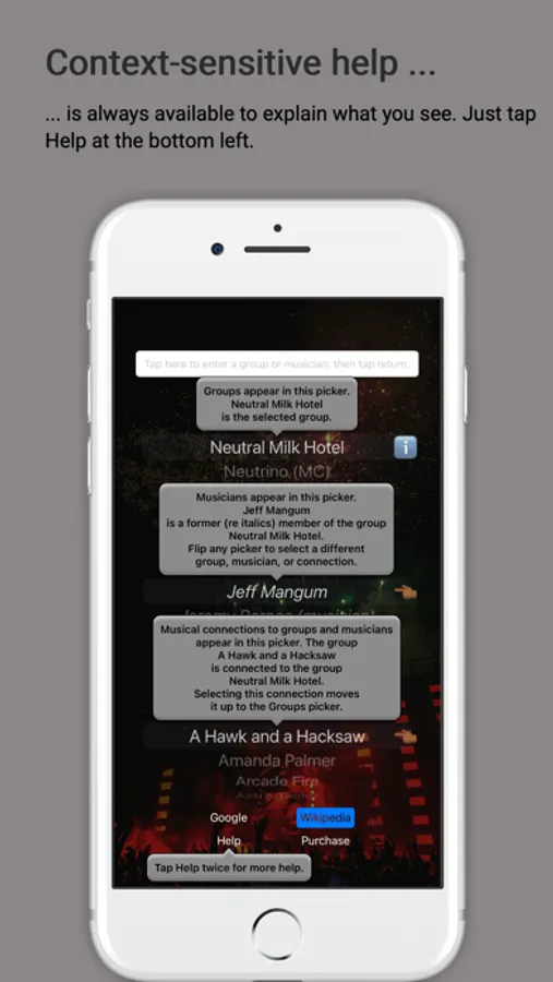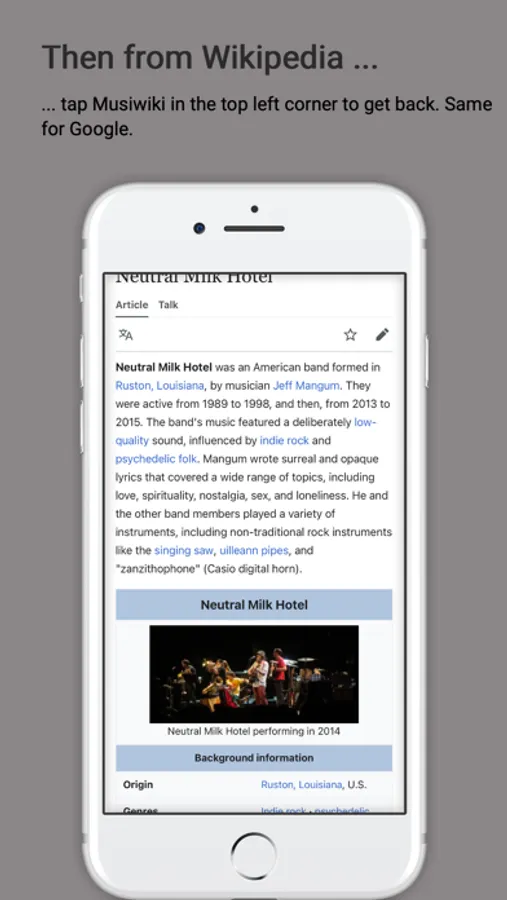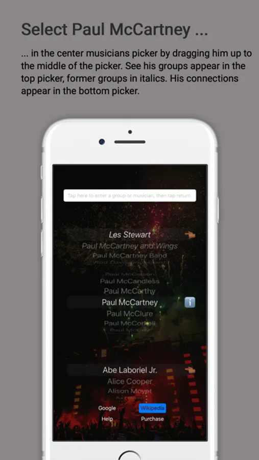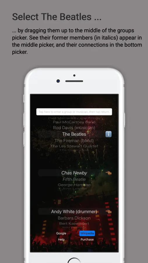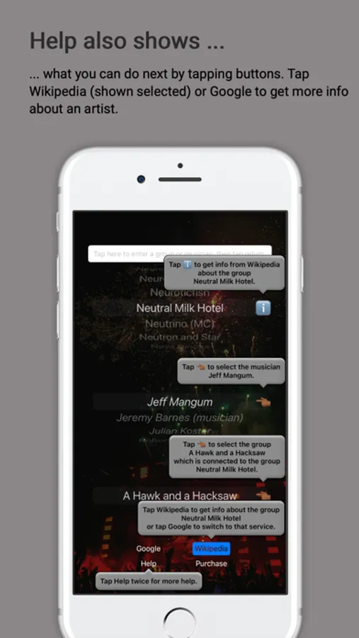 For a group or a musician, enter a few characters of a name, then quickly flip through the resulting artists, from musician to group, from group to musician, from a connection to a group or musician. Hop instantly over to Google or Wikipedia for more info about a musician or group, then hop back again to MusiWiki.