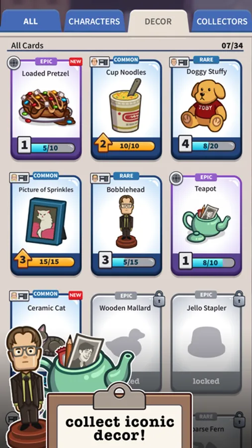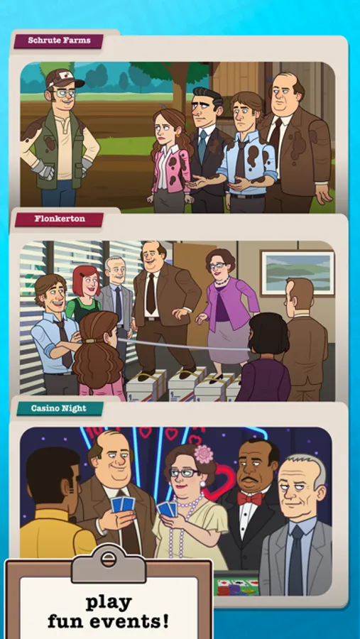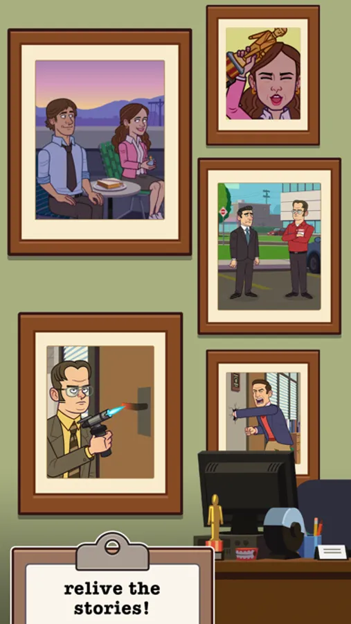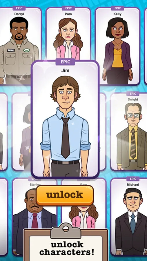 Tap, click, and upgrade to collect some of the most memorable characters from The Office including Prison Mike, Farmer Dwight, Pretzel Day Stanley, and of course Three Hole Punch Jim.