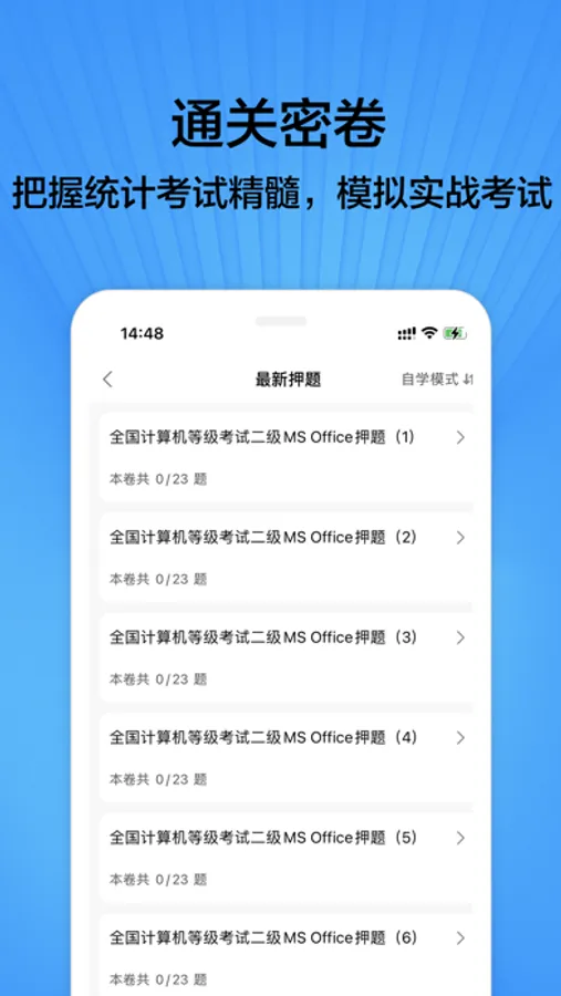 计算机二级考试题库是全国计算机等级考试app,题库含计算机二级Ms office(选择题,上机操作题:字处理题、电子表表格题、演示文稿题) 、计算机二级C语言程序设计,题库实时更新,考点+难点+易错汇总,试题真题附解析,零基础过关无压力。