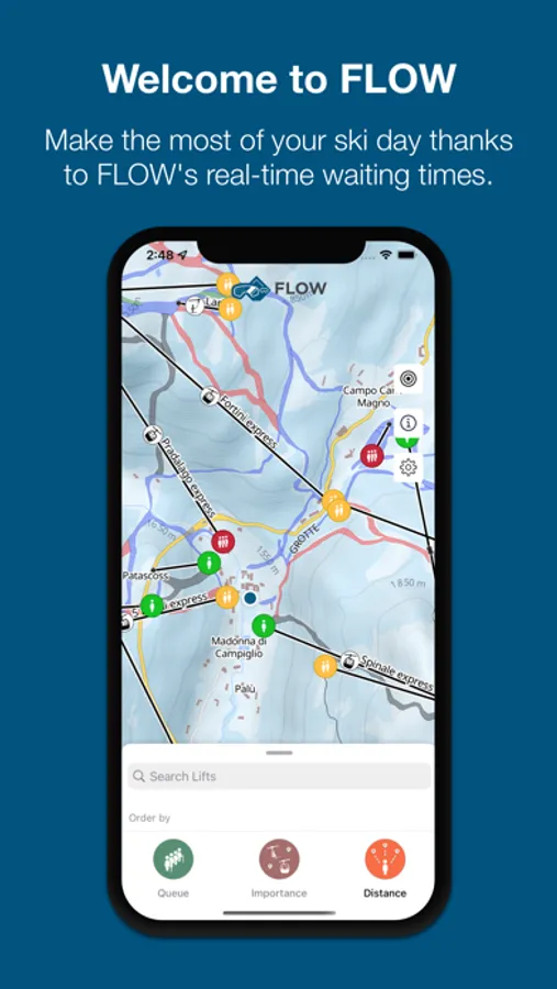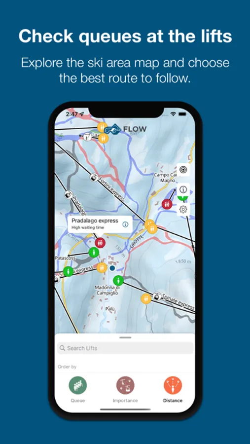 Thanks to the Flow app, you can always keep track of waiting times at the lifts in the skiarea.