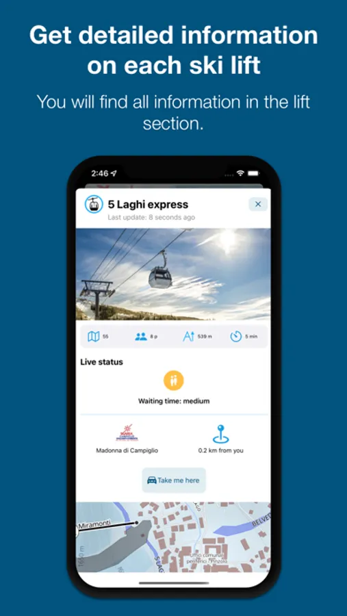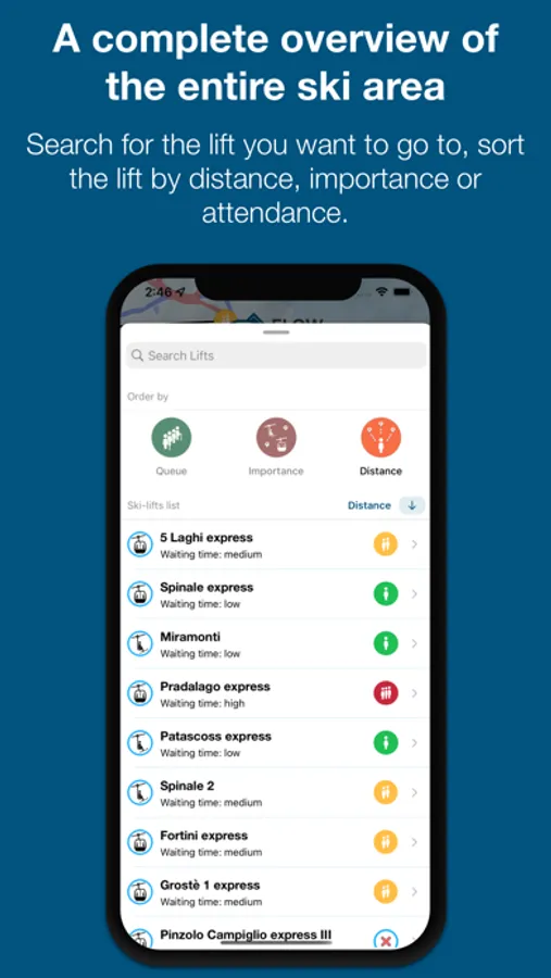 In the list you will always have an overview of the queue situation at the nearest ski lifts.