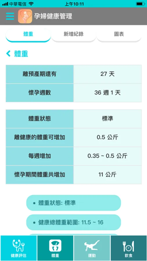 ● 體重:包含目標設定、新增紀錄及趨勢圖表等功能,讓媽咪透過每日紀錄,了解產期的體重變化。