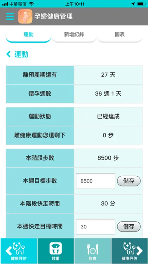 ● 運動:包含目標設定、新增紀錄及趨勢圖表等功能,透過每日的步數與快走時間紀錄,讓媽咪維持產期的運動習慣。