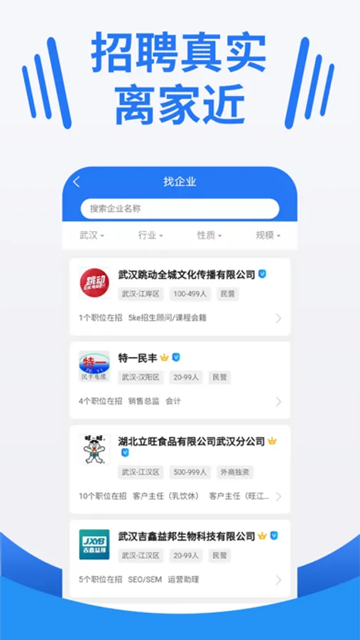 大楚人才网 566job.com-更靠谱的武汉招聘、求职找工作、高薪跳槽app。深耕湖北18年,武汉招聘找工作求职首选APP,精准匹配招聘者和求职者,快速查看。覆盖行业:互联网、金融、教育、汽车、房产、快消、制造、人工智能、广告传媒等各行各业,现已成为销售、财务、技术、IT、产品、人资、管理……广大求职者选择的应用APP。海量高薪职位每天更新,智能推荐算法,高效撮合,让好工作主动找你!