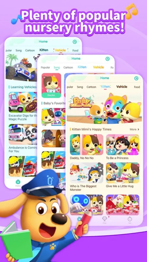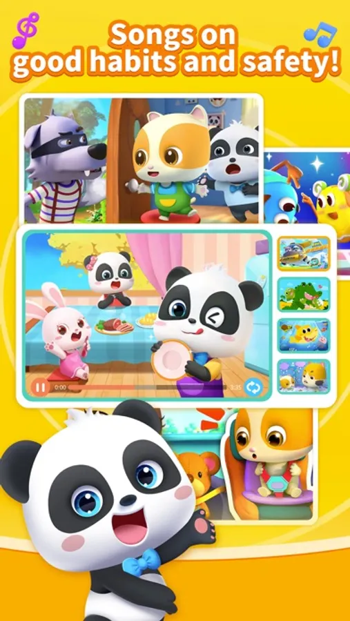 Our APP is a collection of many kids' favorite characters, including Baby Panda Kiki & Miumiu, Mimi, dinosaurs, monster car, and Donny. It offers plenty of kids songs and cartoons that are safe and free of charge!