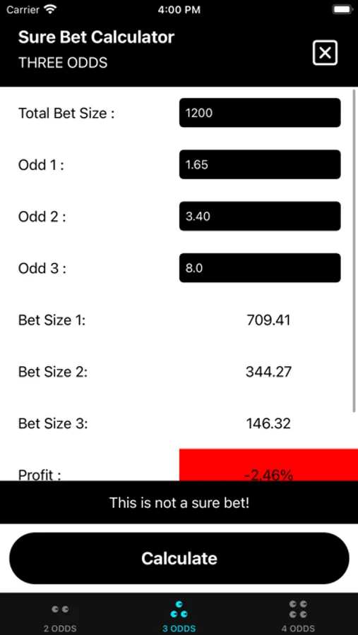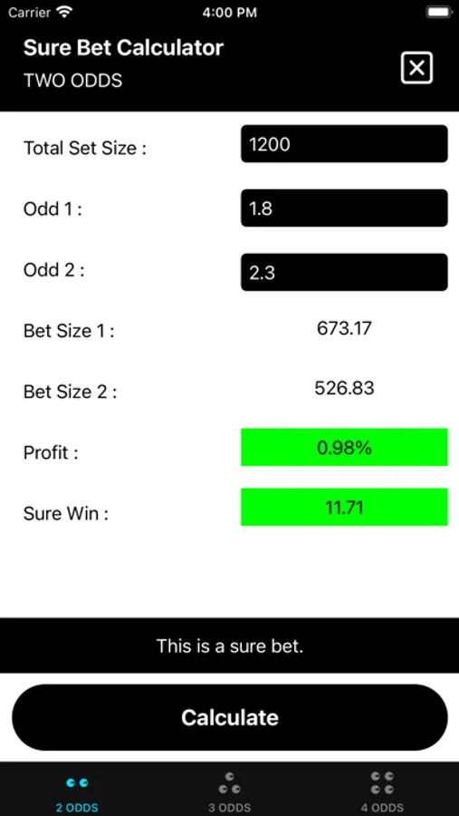 Sure Bet Calculator is a helper tool for people who like to analyze their bets. With Sure Bet Calculator, you can analyze 2 and 3 odds bets and see if they are sure betting tips.