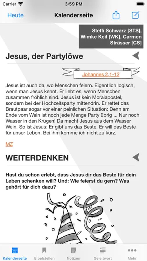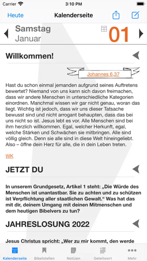 Bibellesen macht Spaß mit der Bibellese-App von „START in den Tag“. Du findest darin für jeden Tag des Jahres einen anregenden Bibelimpuls und verständliche Auslegungen. Durch die Hintergrundinfos kannst du neu in die Welt der Bibel eintauchen und die alten Texte besser verstehen. Und was dir gut gefällt, speicherst du in den Notizen oder teilst es mit Freundinnen und Freunden. Mit dieser App fängt dein Tag gut an!