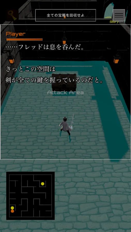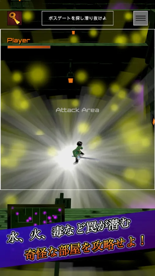 このゲームは迷路になった3D空間の中を、ガイドに従いながらアクションを進めていきます。宝箱を取ったり、敵と戦ったりなど、制限時間なしでじっくり遊ぶことができます(WARNING表示が出たら、プレイヤーのHPが減っていきます)。