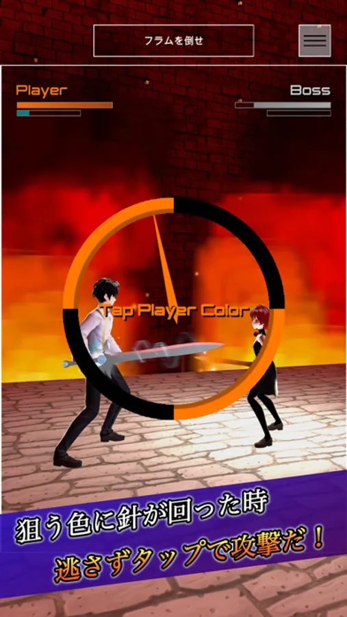 ボスステージでは、オレンジ色と黒に分かれた輪が登場します。その中心を針が回っていくので、オレンジ色を目掛けてタップすると、プレイヤーがボスを攻撃します。逆に黒に針が当たった状態でタップすると、ボスがプレイヤーを攻撃します。