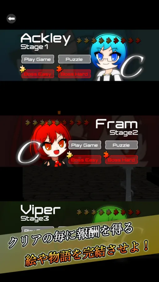 各ステージのボスを倒すことで、ストーリーが順番に解放されていきます。そしてパズルも一つ獲得できます。パズルを集めることで絵が出来上がっていき、Easyモード、またはHardモードのボスを特定数倒すと完成します。