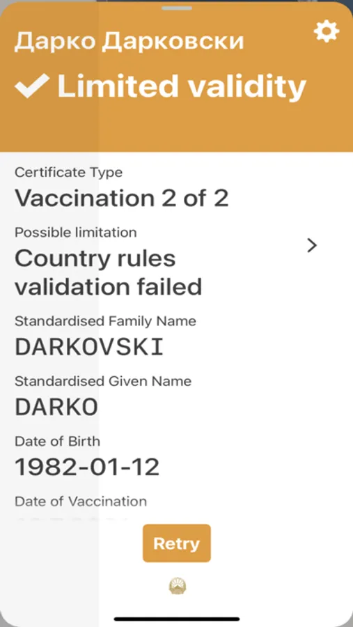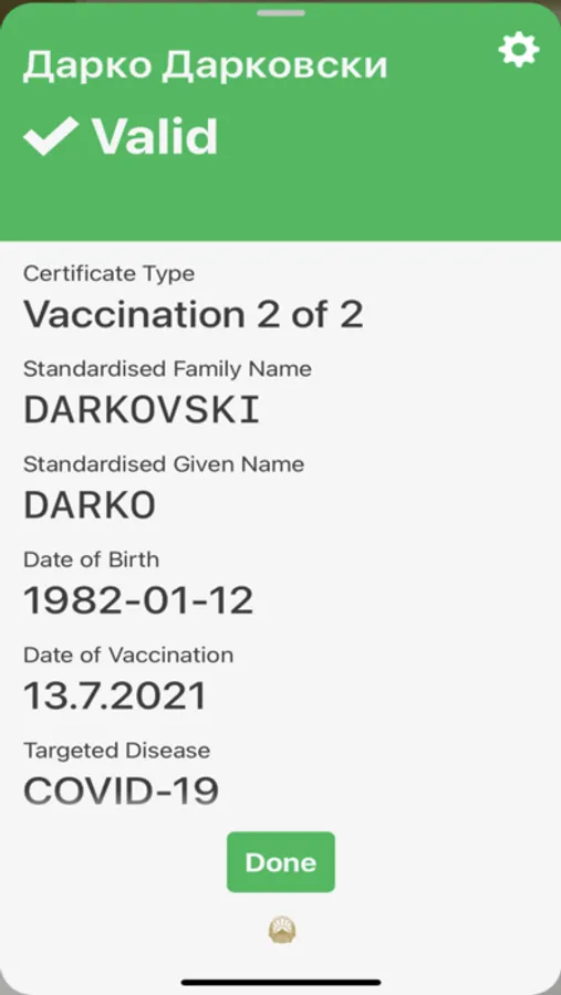 The MK Verifier app verifies the EUDCC by checking the authenticity of the signature of the DCC using the public key of the DCC issuer.