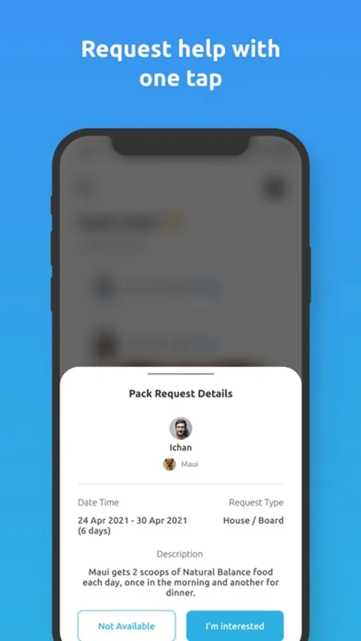 Put your Pack to work. Going out of town and need to know who is around to watch your pet? A simple interface makes it easy to send a request notification to all members of your pack at once. You can view and start conversations with any friend who says they're available to help.