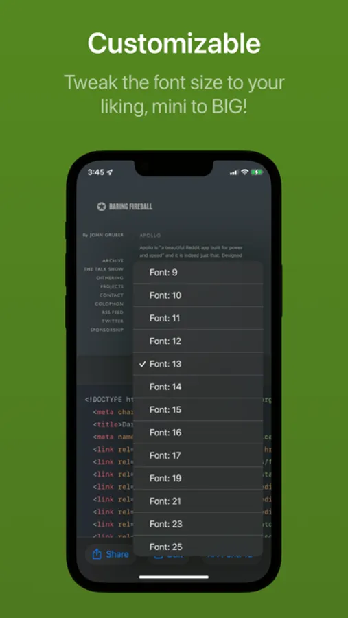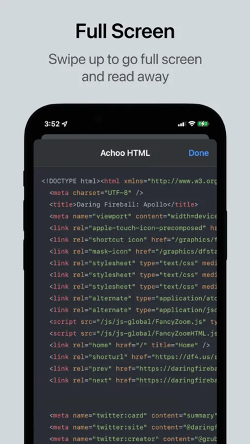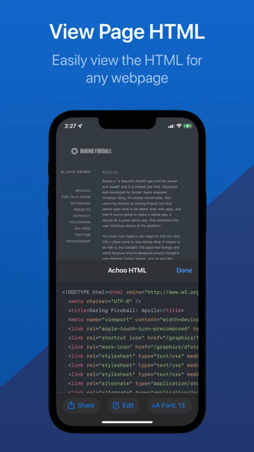 You can share the HTML you're viewing, allowing you to easily inspect it on an external device of your choosing, or send it to a friend, or simply copy it to your clipboard.