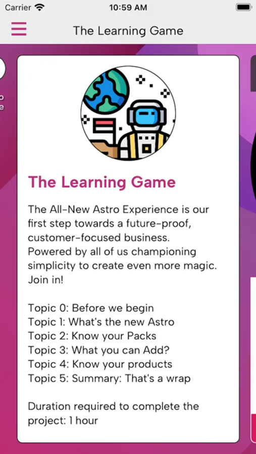 Welcome to Astro Playbook! This is Astro’s first gamified learning platform, and we aim to provide fun interactive games and activities. Our challenges are specially curated to help you gain skills and knowledge of the products and services that we have to offer. Get ready to maximize your learning experience with us!