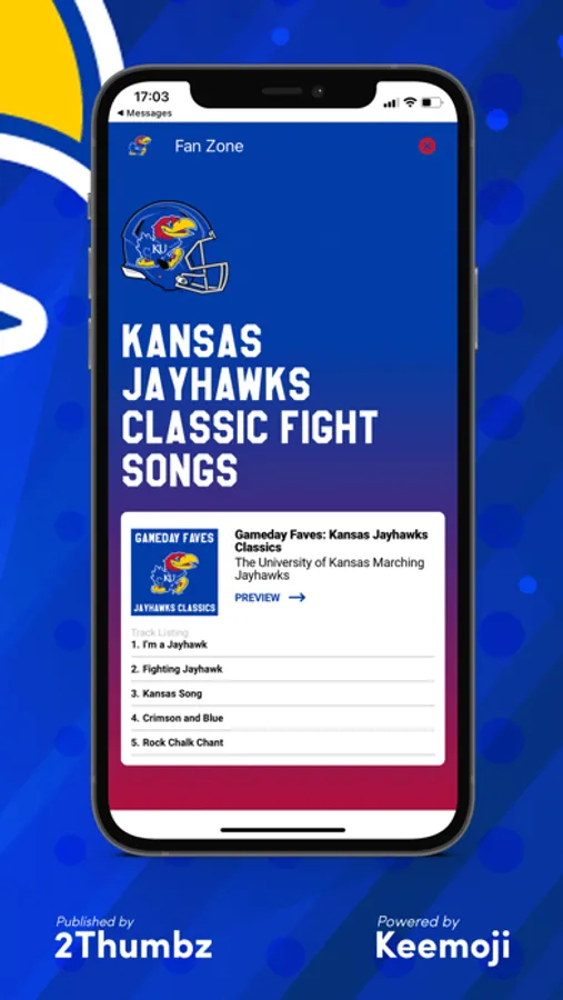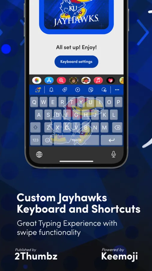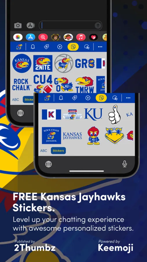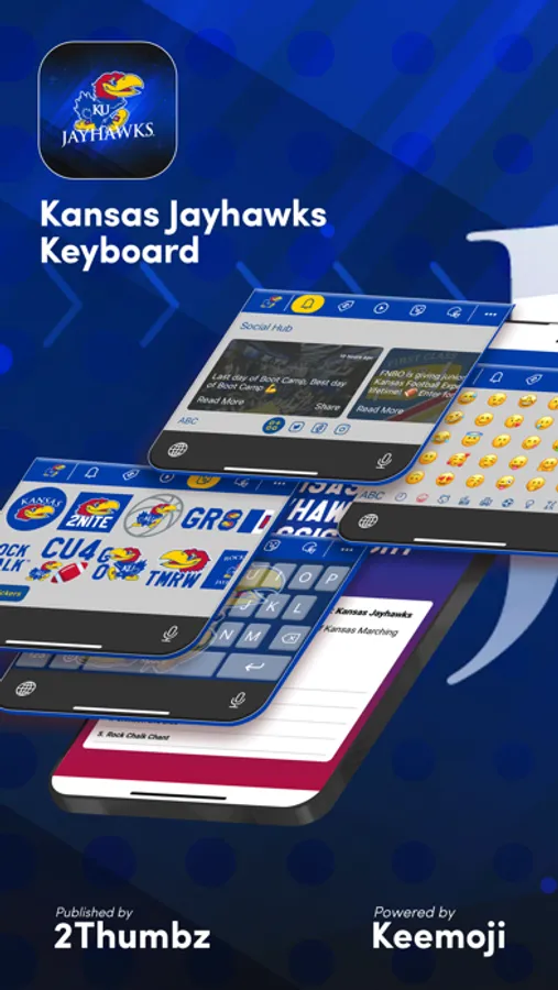 Kansas Jayhawks Keyboard is an officially licensed app for enjoying the full Kansas University Athletics experience. This app is owned and published by 2Thumbz, a leading mobile app development company and a trusted collegiate publisher since 2003.