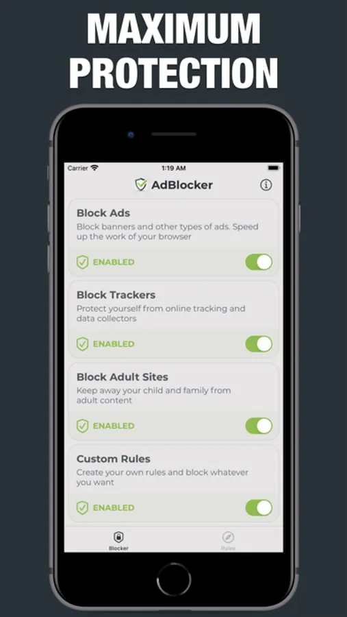This extension is integrated in Safari and doesn't require a third party browser. Simply install and enable it to prevent any ads, trackers and adult sites from opening on your iOS devices.