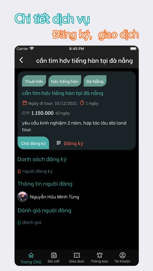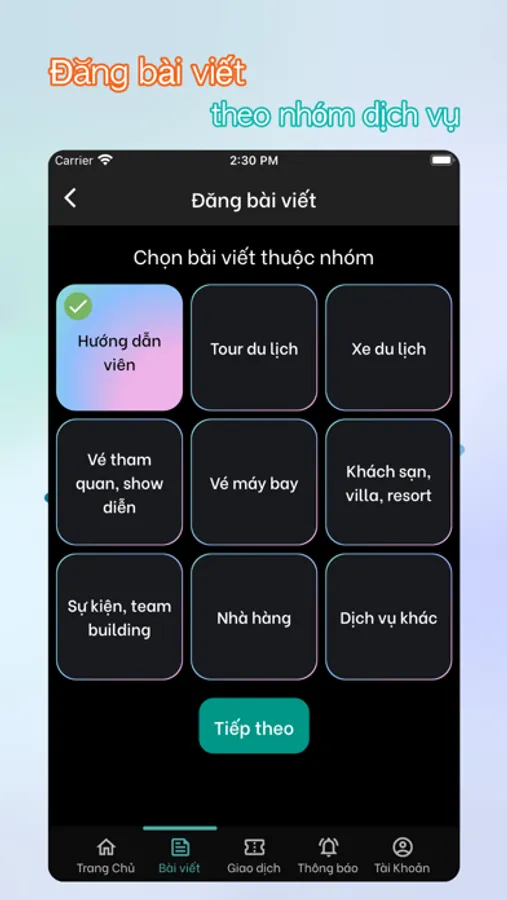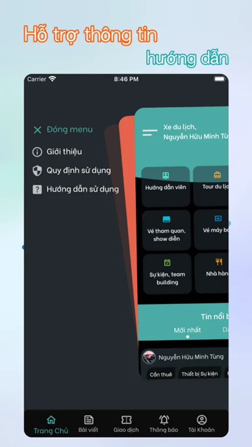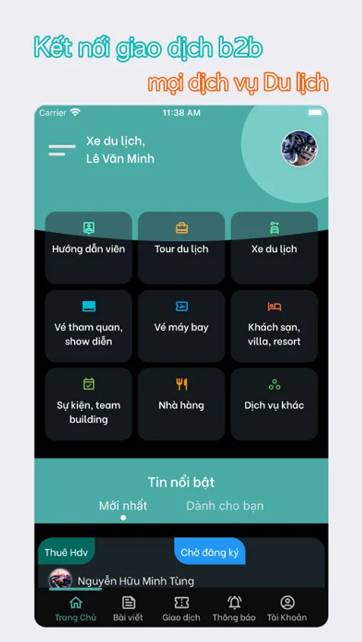 - Tài khoản: Đăng ký tài khoản qua số điện thoại, xác thực OTP tin nhắn. Mỗi tài khoản sẽ chọn lĩnh vực Du lịch mà mình hoạt động để đăng bài, nhận thông báo các tin liên quan.