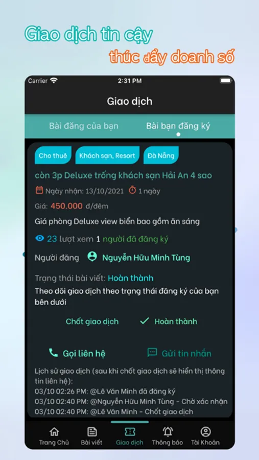 - Giao dịch: các giao dịch đăng ký giữa bạn và các tài khoản khác. Đánh giá các giao dịch được thực hiện.