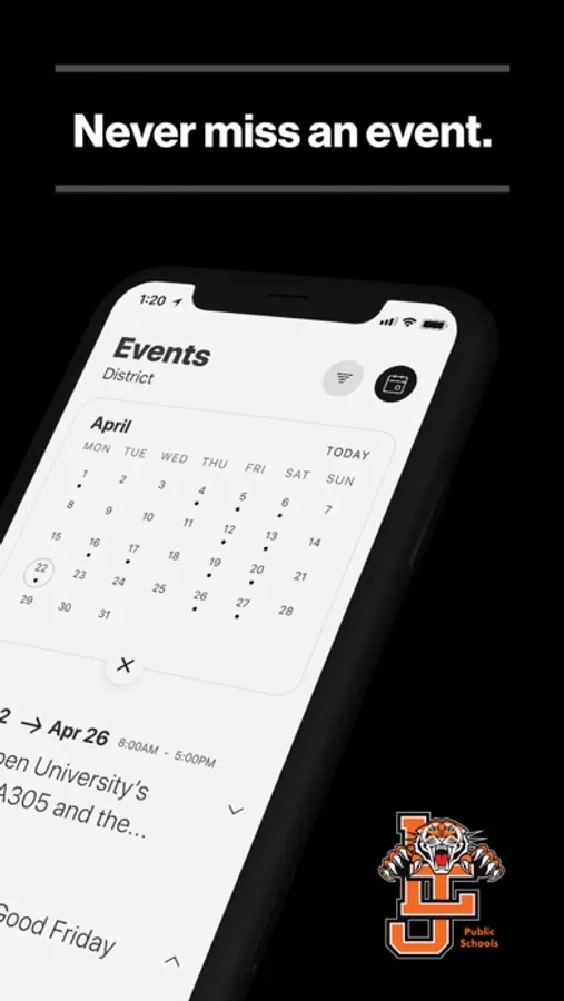 The event section shows a list of events throughout the district. Users can add an event to your calendar to share the event with friends and family with one tap.