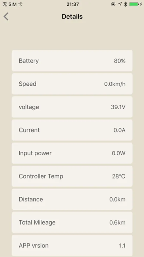Hier findest du sämtliche Fahrinformationen wie Batterie-Zustand in Prozent, aktuelle Geschwindigkeit in km/h, Spannung der Batterie, aktuelle Stromstärke, aktuelle Motorenleistung in Watt, Regler-Temperatur, gefahrene Distanz in Km, total gefahrene Distanz in Km, sowie die aktuelle Firmware Version.