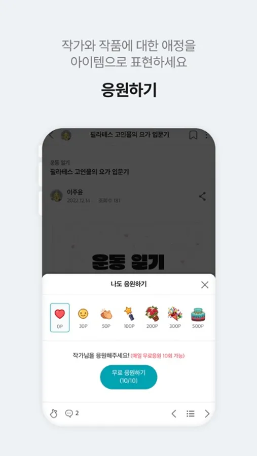 - 작가와 작품에 대한 애정을 응원 아이템으로 표현하세요.