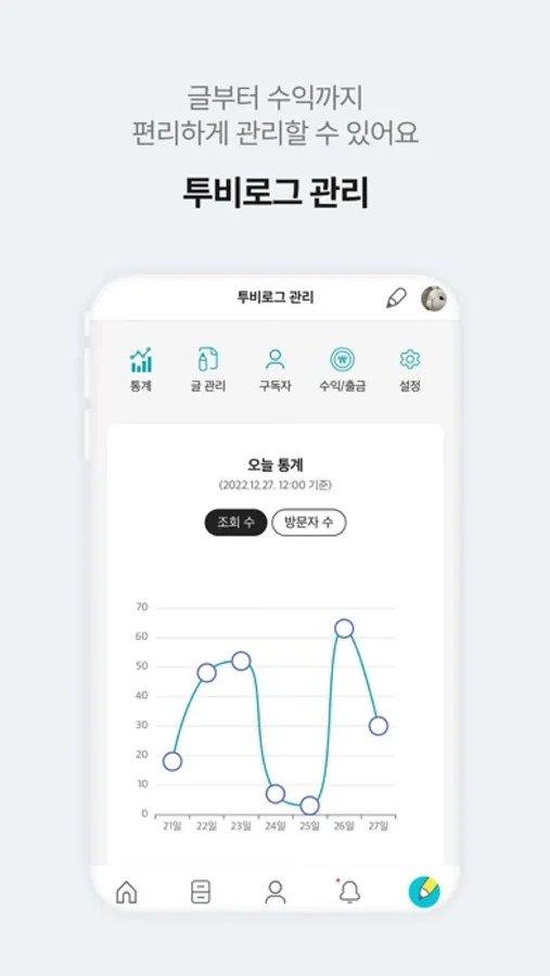 - 통계로 독자들의 반응을 살펴보고, 수익 내역을 편리하게 조회할 수 있어요.