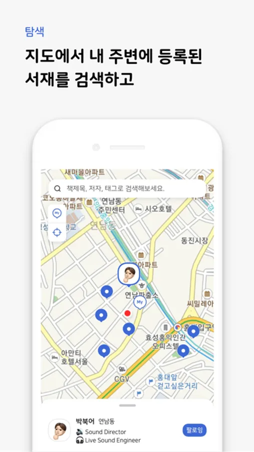 - 지도에서 주변의 서재를 둘러보고 친구를 맺어보세요.