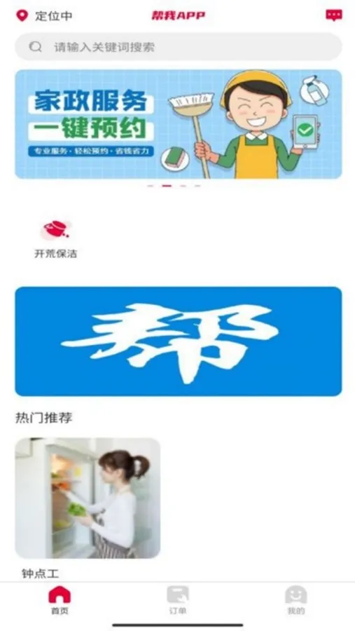 1.帮我APP是一款专业的家庭类服务平台,涵盖了家政保洁、电器清洗维修、管道疏通、开锁换锁、智能安防,智能家居,等各类家庭服务。用户下单,服务工程师接单,平台通过对接用户的订单需求,以派单和抢单模式分配给平台认证的专业技师和维修工程师,从而完成订单。