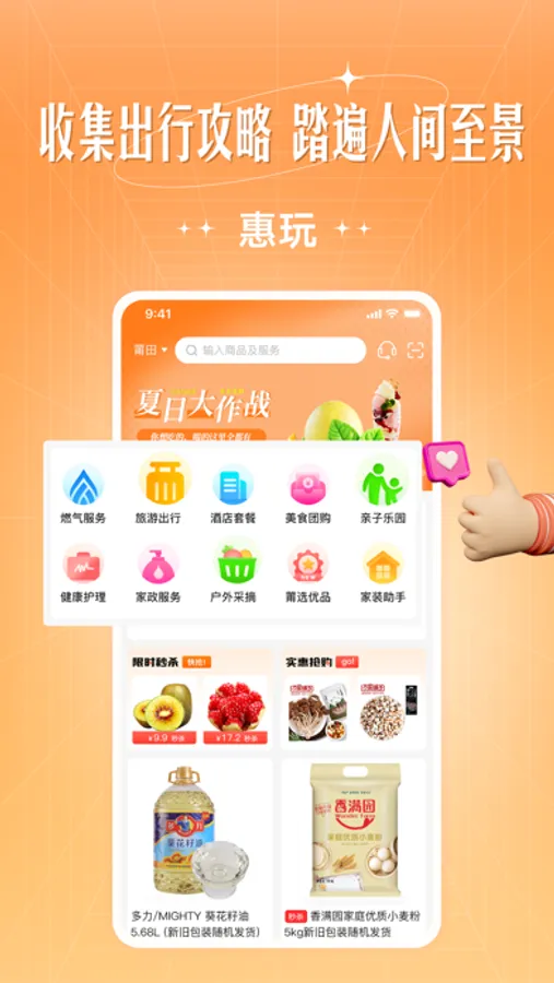 涵盖燃气充值、美食团购、亲子出行、生活超市等。