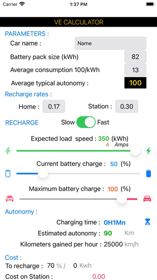 The application allows you, based on a few parameters, the size of the battery pack and the typical consumption of your car, to calculate numerous data: Time and kWh to charge, costs, kilometers gained per hour, end of charge time and range.