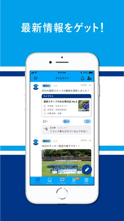 横浜FCからの投稿や速報情報を見ることができます。またアプリ内での活動に関する様々なニュースが随時投稿される機能です。
