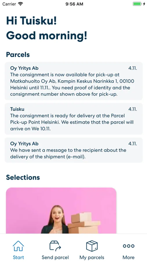 Use the app to send a parcel anywhere in Finland or even abroad. As the app retains the last address you sent a parcel to, sending parcels to your favourite address couldn’t be easier.