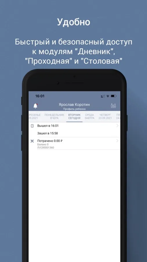 Приложение содержит модули «Электронная проходная» и «Электронная столовая», что позволяет родителям: