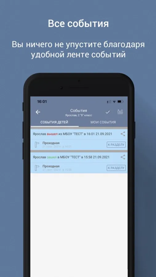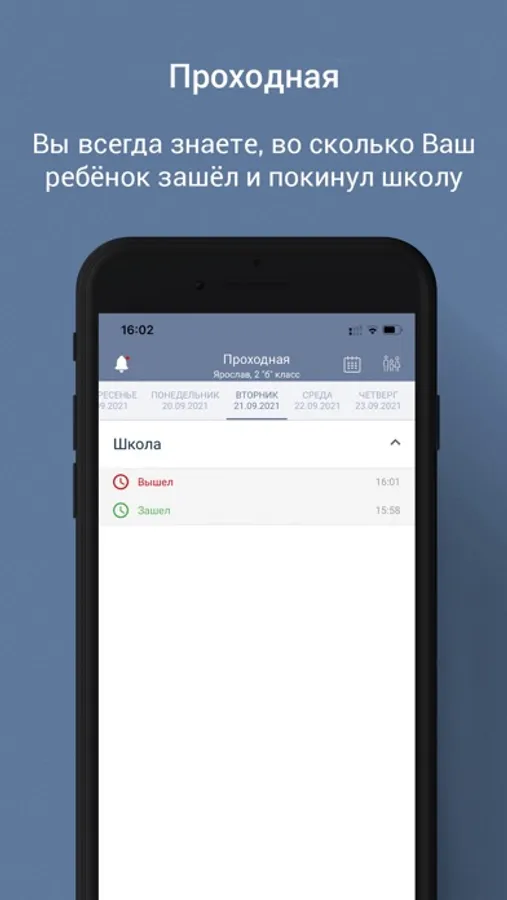 - получать оповещения о входе и выходе ребенка из школы с помощью Push-уведомлений и E-mail;