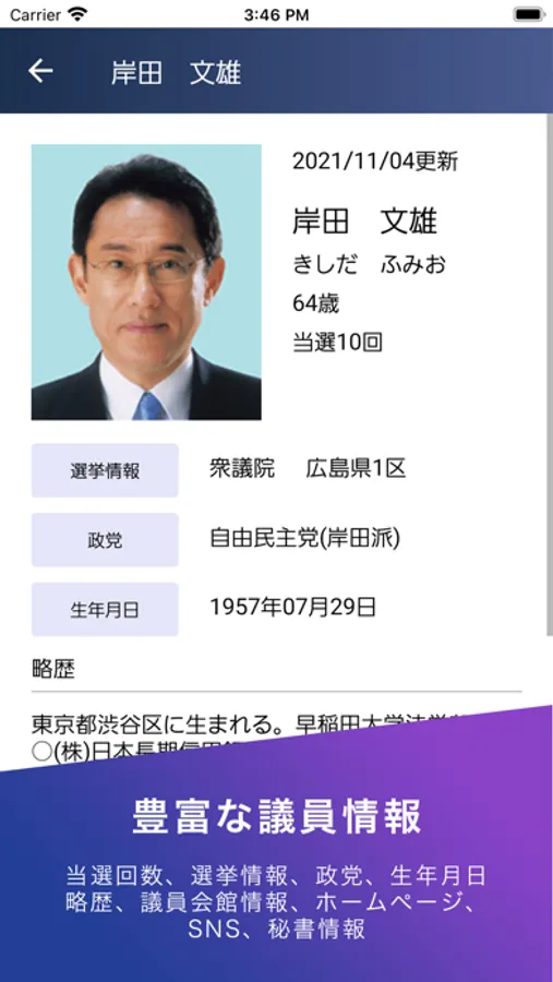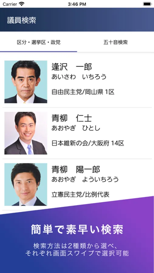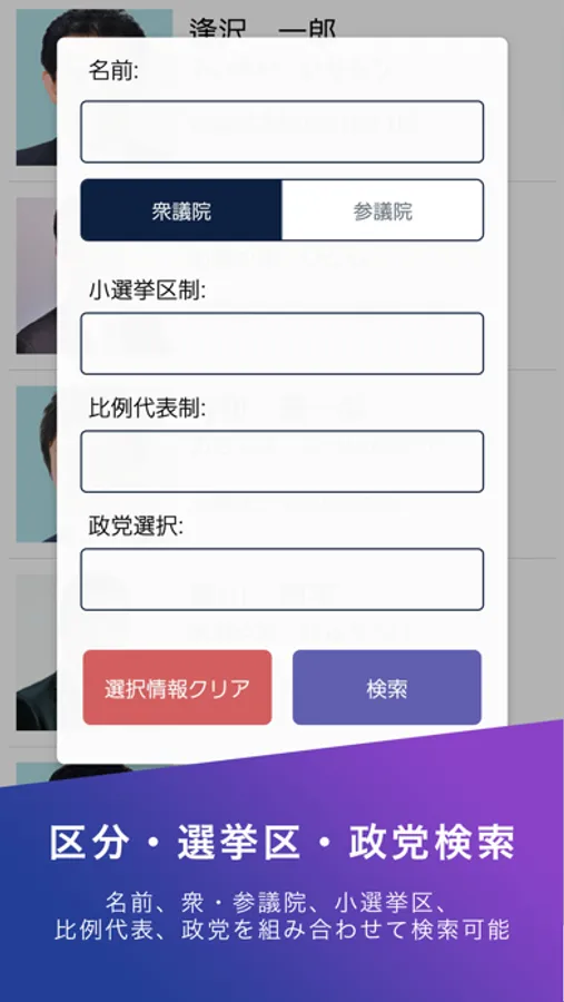 衆議院・参議院の国会議員すべての情報がこのアプリで簡単に検索できます。