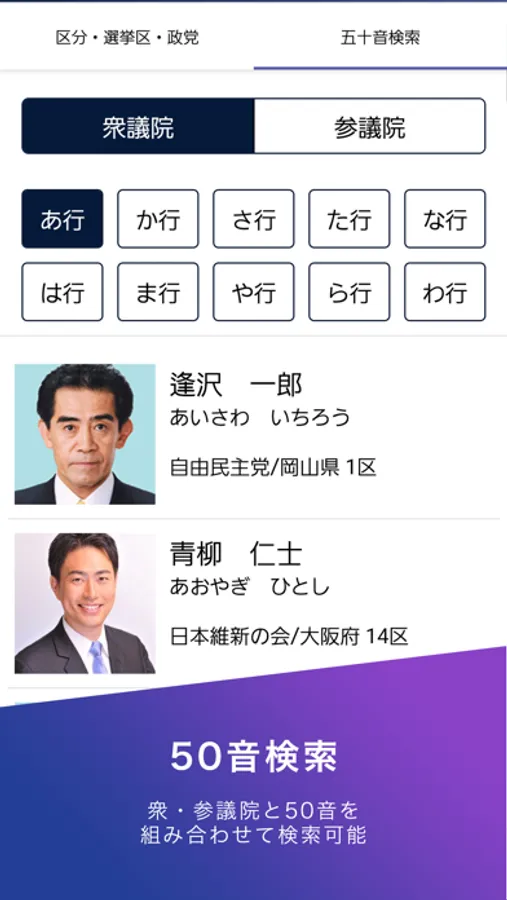 衆議院/参議院、名前、小選挙区/比例代表、政党、50音