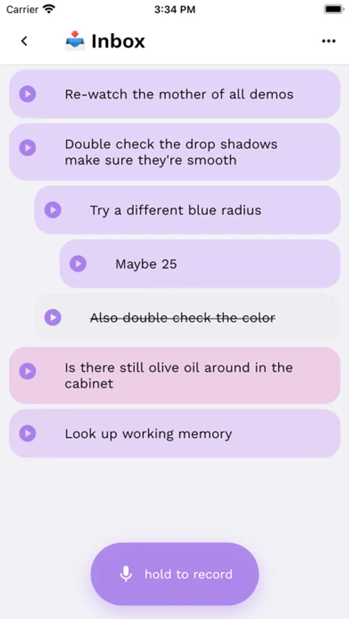 Hold record, say what you want, and release. Just like you'd expect from an outliner, create hierarchies and rearrange. Notes are auto-transcribed and searchable, but you can always play back the audio.