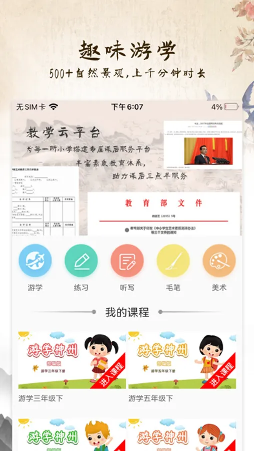 游学神州是面向一到六年级学生的课程,包含读课文,游神州,识汉字3大板块。原创视频情景剧导入,延伸剧情讲解教材,全国多个自然景观,上千分钟的时长,以著名景点为载体,带同学领略神州大地,加深学生对课文内容的理解,增加孩子学习兴趣,提升学习效果,减轻教学压力,共享最优质的教学内容和服务。