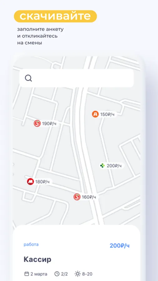 Скачайте приложение, загрузите свои документы и выберите интересующие вас предложения. Оказывайте услуги крупным логистическим центрам, федеральным торговым сетям в качестве РТЗ, кассира, грузчика, упаковщика, комплектовщика, пекаря, повара и других функций.