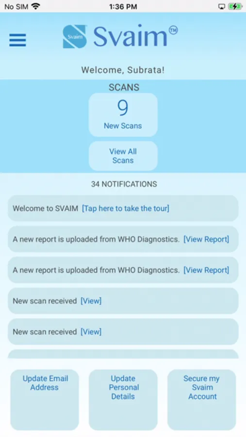 - View your medical records : As soon as your records are ready, you will get a notification on your mobile phone that your medical record data is ready on Svaim. Please open the Svaim app from the comfort of your home or anywhere and securely view and share your medical records either for a second opinion or with your doctor.