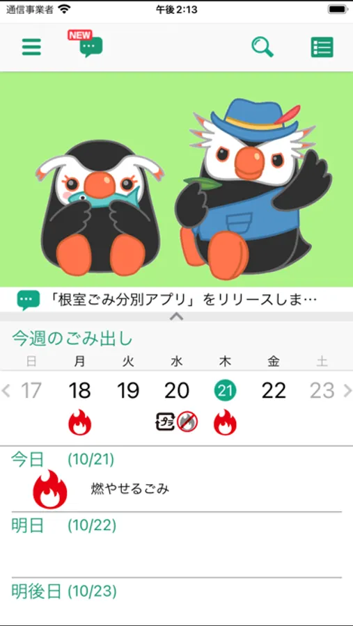 収集日変更のお知らせやイベント情報などを確認することができます。