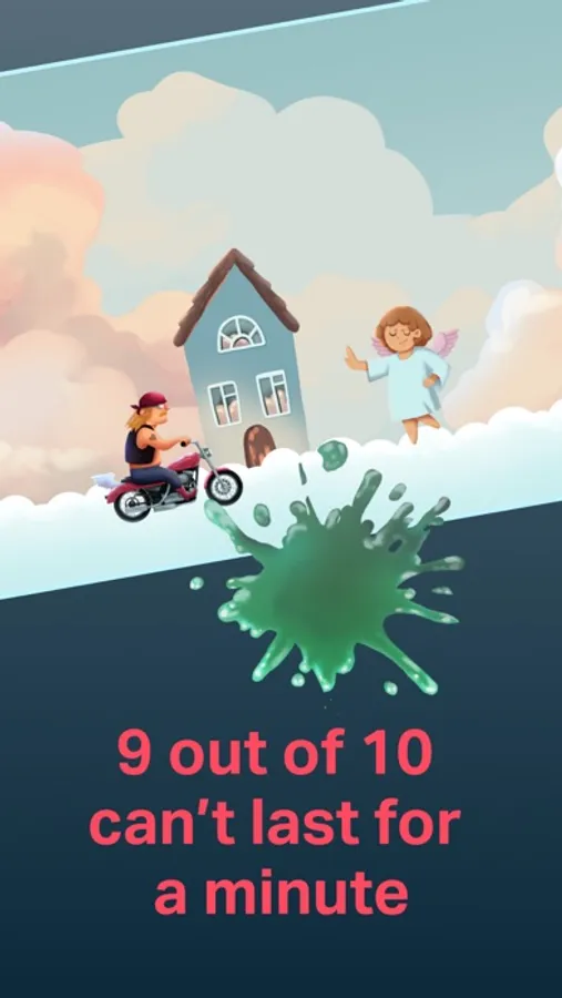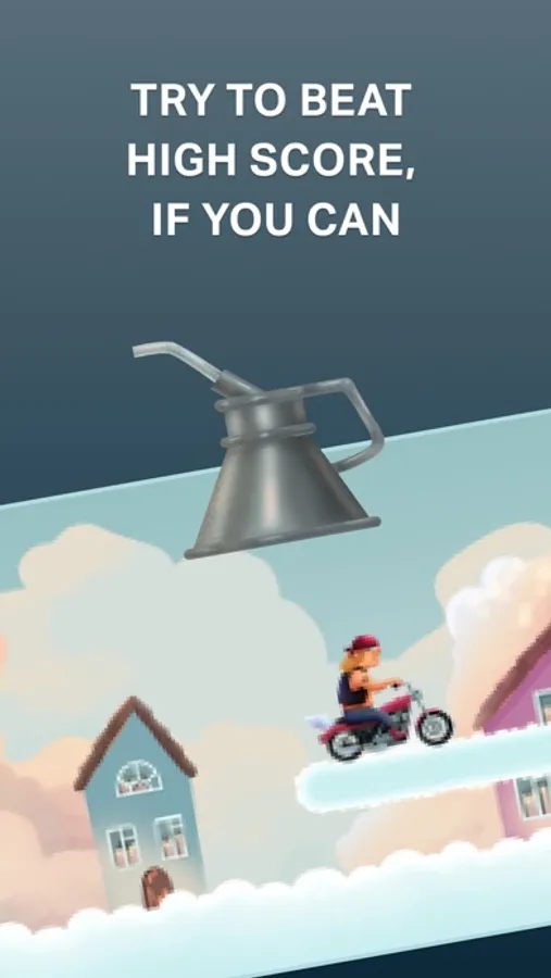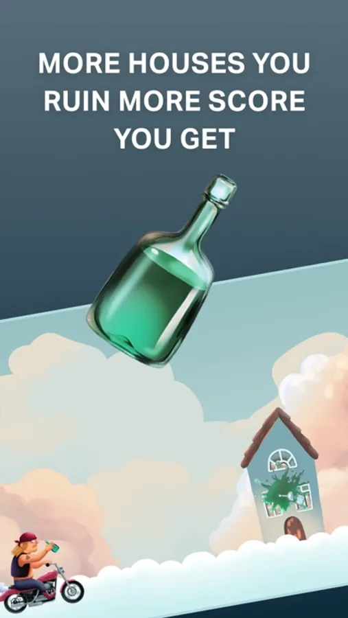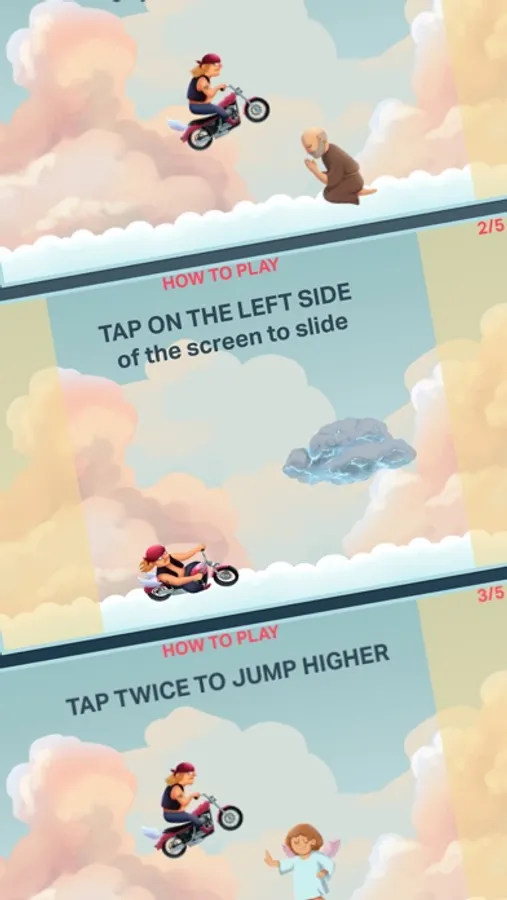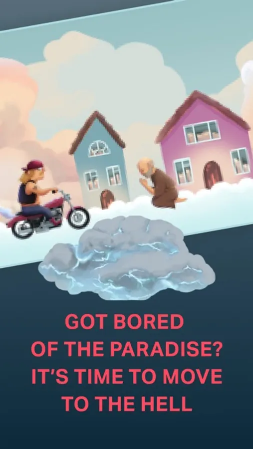 A game about a biker who ascends to heaven with his motorcycle. The biker rides across the heaven, jumping over angels and saints. During the passage of the line runner, the player will be able to spoil the marshmallow everyday life of the inhabitants of paradise by throwing bottles of paint over their houses. To do this, during the race, the biker must slide under the thunderclouds, picking up the projectiles for throwing.