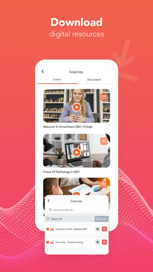 Cut down on printed collateral by going digital. Virtual & in-person attendees can access all their resources on the mobile app, including videos, images, presentations, brochures & more.