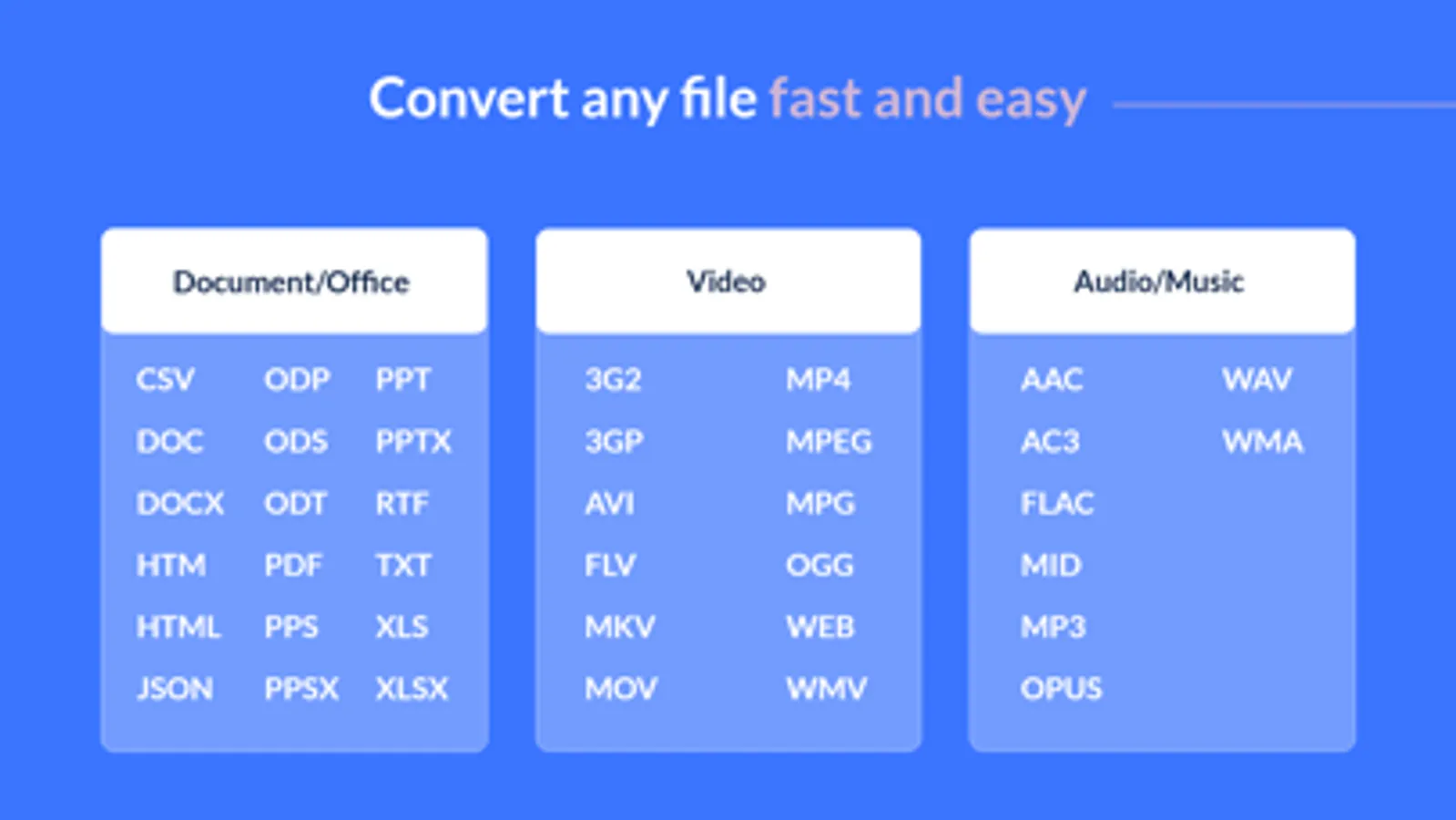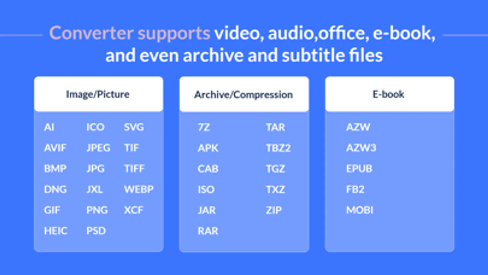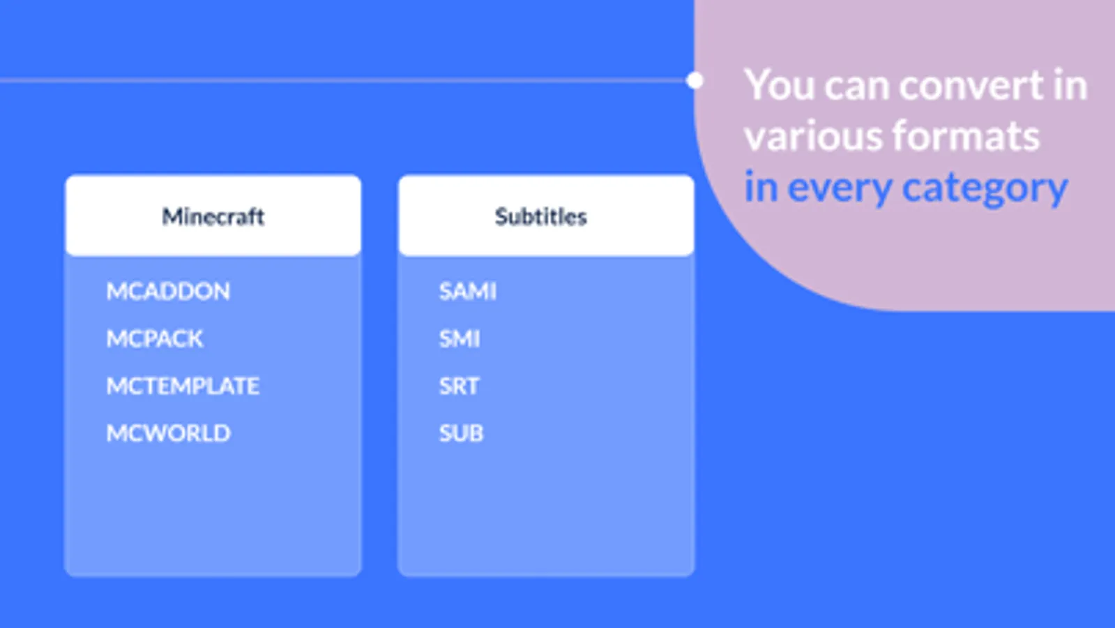 You won't need multiple apps for converting documents, images, audio or video, Bestys File Converter can meet all your needs. You can also convert archives, ebooks, subtitles and Minecraft files.