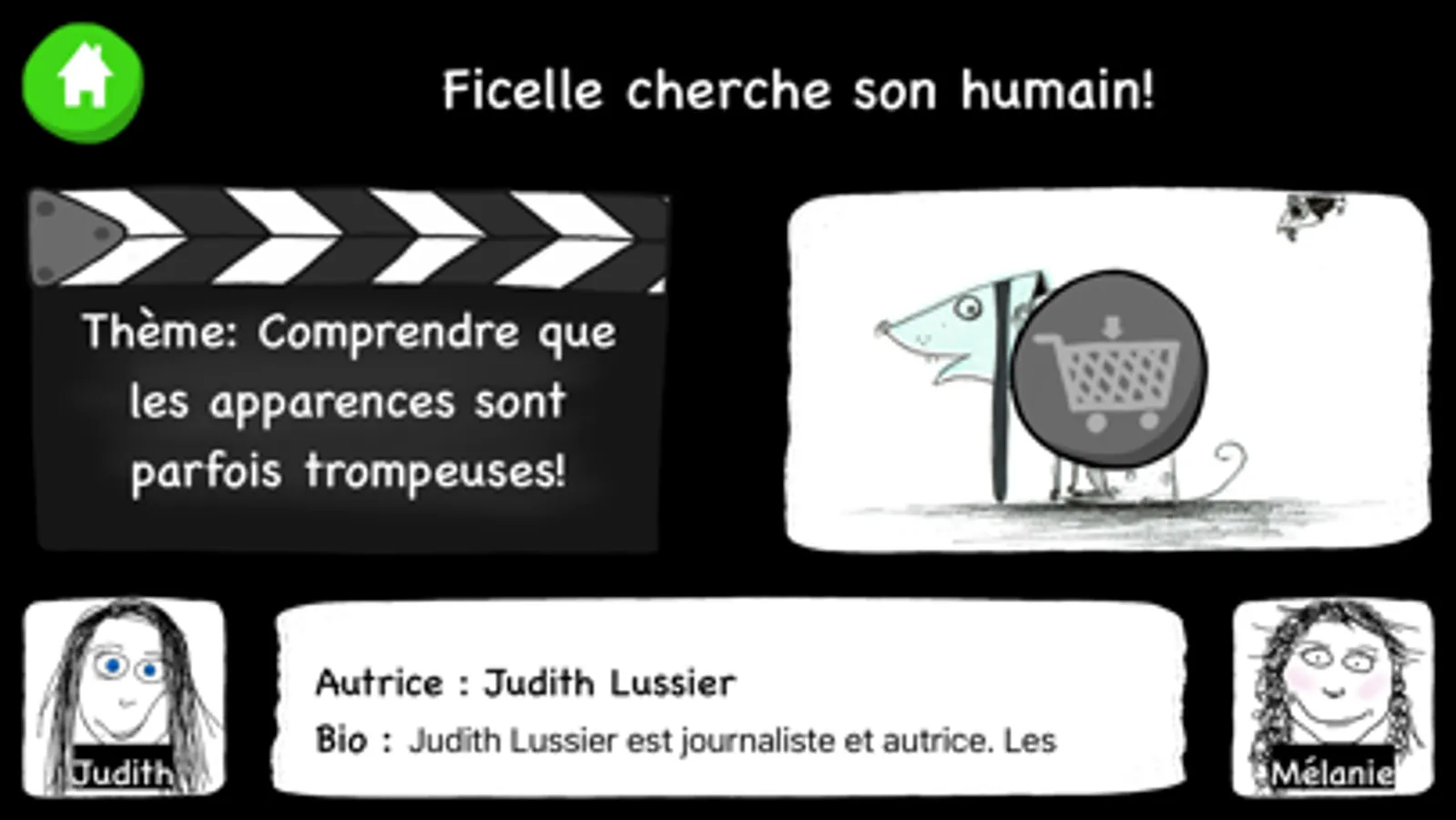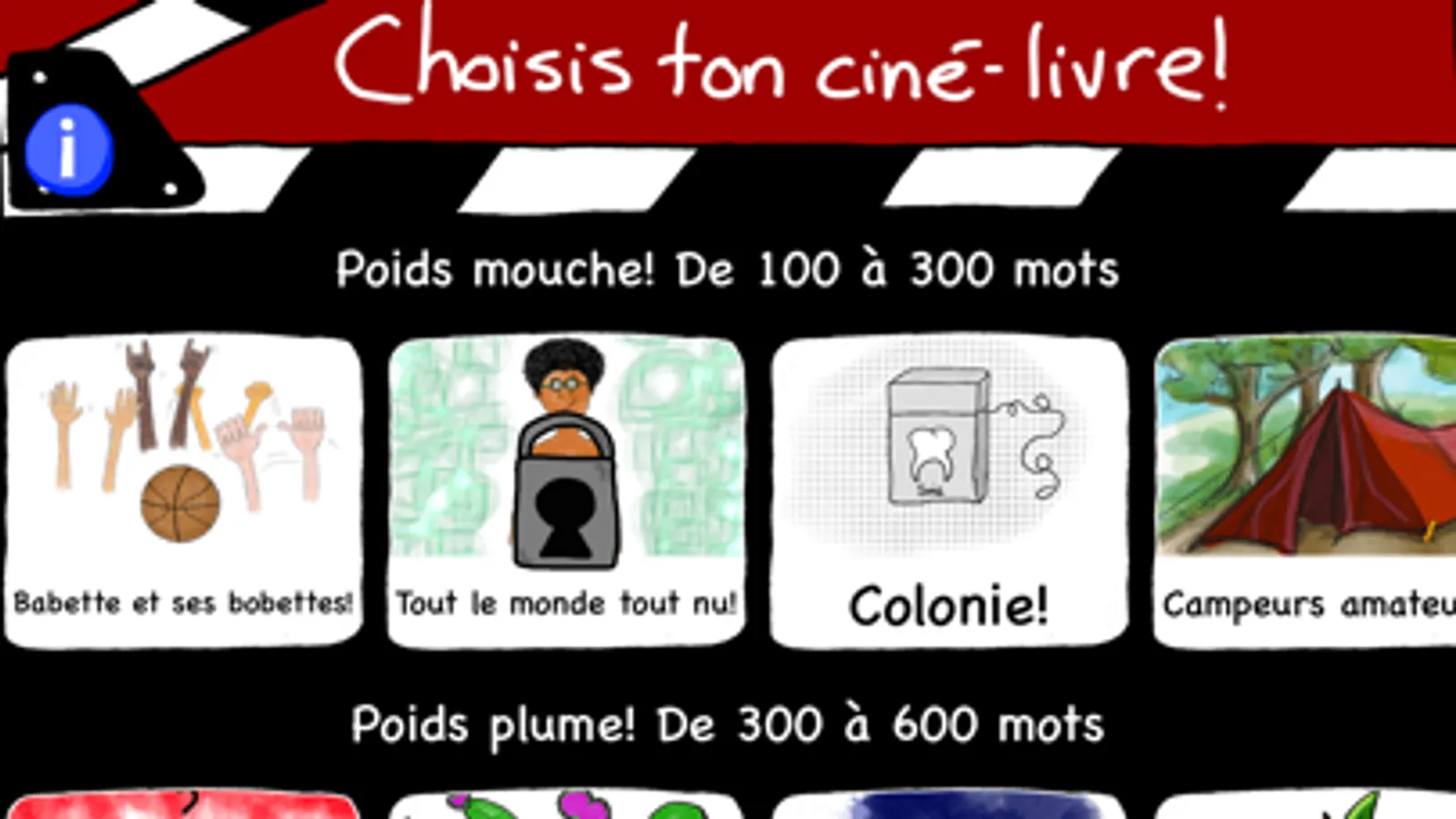 Cette application ludique de ciné-livres s’adresse principalement aux lecteurs ayant entre 9 et 12 ans. Elle est aussi très recommandée aux jeunes dyslexiques vivant avec un défi concernant le langage écrit. Les ciné-livres sont classés selon leur nombre de mots et peu importe le nombre, toutes les histoires sollicitent un bon niveau de compréhension. Pour être encore plus enrichissants, les livres renferment un vocabulaire riche et varié en ayant soin d’offrir aux lecteurs des définitions simples pour les termes plus complexes. Pour éviter aux jeunes lecteurs un sentiment de surcharge visuelle ou cognitive, une seule phrase ou segment de phrase est présenté à la fois. Le choix de la police et la taille des caractères favorisent la lecture globale comme la lecture syllabique. L’enfant ayant besoin de plus de soutien peut se faire lire les segments de phrase à l’aide d’une synthèse vocale (lecture orale). Cette appli est équipée d’un système de renforcement (casse-tête) positif généreux établi dans le but de donner confiance aux lecteurs en plus de le valoriser. Ultimo, cette application suivant la trame du cinéma, invite les lecteurs à considérer la lecture comme un « film ». Par ses images qui se laissent découvrir peu à peu, elle donne la chance aux enfants d’évoquer d'abord eux-mêmes leurs propres idées images, souvenirs, repères.