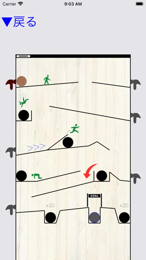 ハンマーで10yenを弾き、ゴールへと導いていきます。