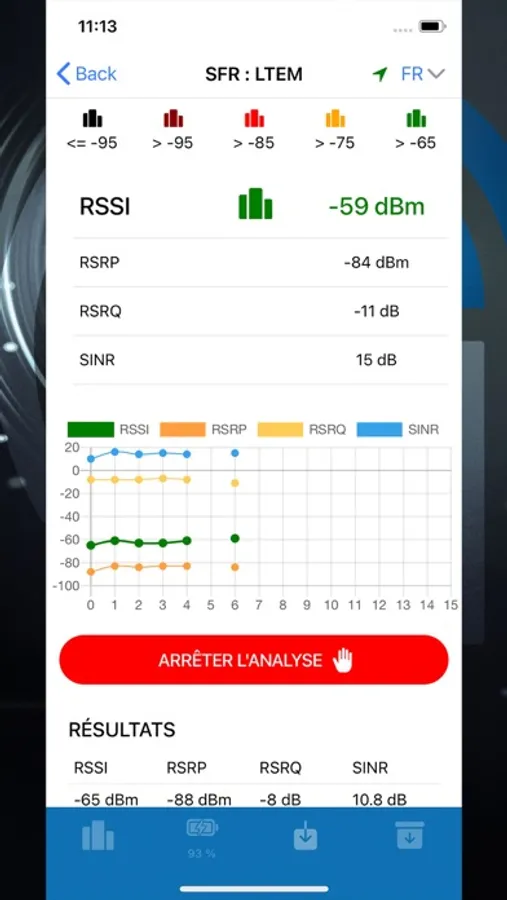 - A detail page to do regular pings on a specific network and technology. For example: Orange and LTE (4G). A curve will display the pings made. The export key to retrieve the scan data in a .csv file readable either in Excel or in a notepad.