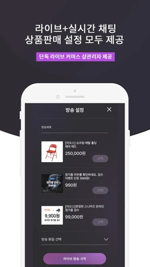 2. 샵 관리자에서 라이브방송 설정과 판매할 상품을 나의 쇼핑몰과 손쉽게 연동할 수 있습니다.