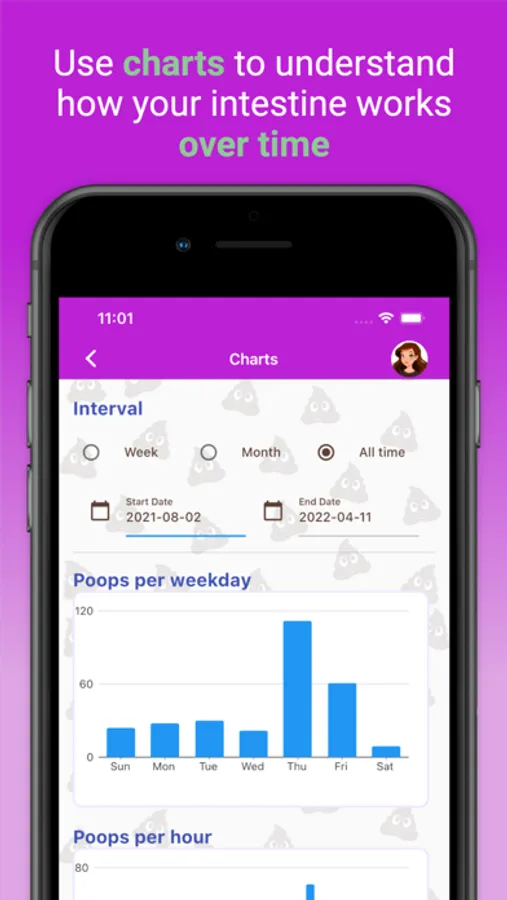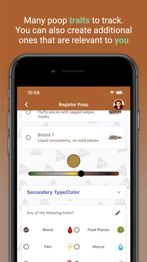 Use the Bristol scale to classify your poop, record information such as duration, quantity and color, as well as personalized notes and photos (don't worry, your privacy will always be respected).
